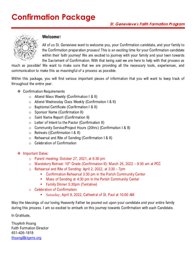 Confirmation Packages. Genevieve's Faith Formation ProgramWelcome! All of us St. Genevieve want to welcome you, your Confirmation candidate, and your family to the Confirmation preparation process!
