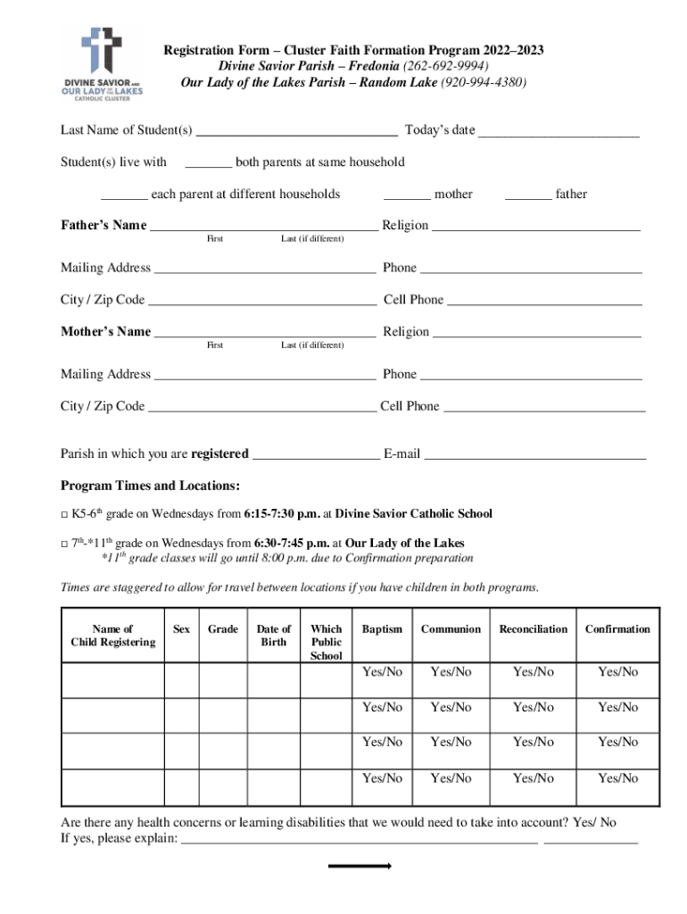 Registration Form Cluster Faith Formation Program 20222023 Divine Savior Parish Macedonia (2626929994) Our Lady of the Lakes Parish Random Lake (9209944380) Today's date ___Last Name of Student(s)