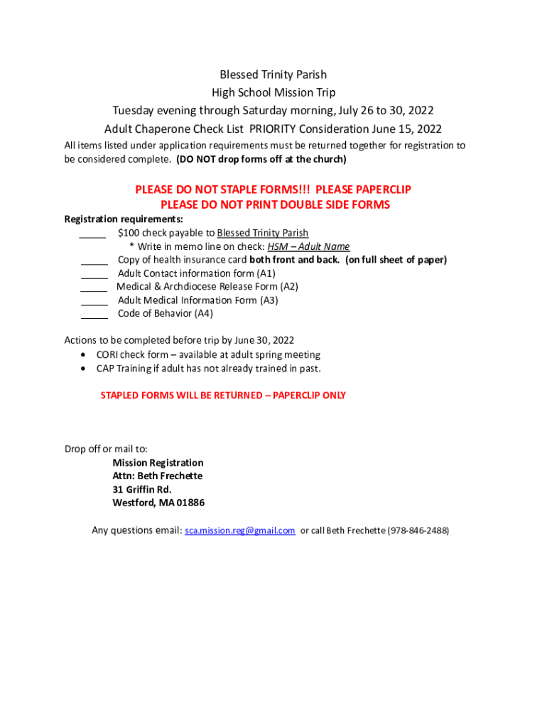 Blessed Trinity Parish High School Mission Trip Tuesday evening through Saturday morning, July 26 to 30, 2022 Adult Chaperone Check List PRIORITY Consideration June 15, 2022, All items listed under