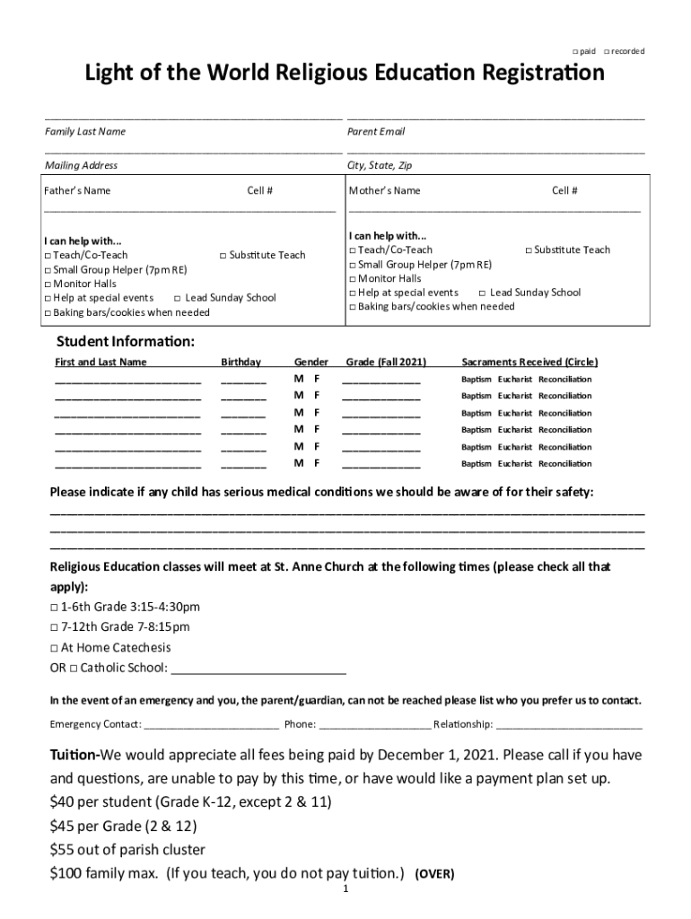 Paid recordedLight of the World Religious Education Registration ___ Family Last Name ___ Mailing Address___ Parent Email ___ City, State, Zip Fathers Name Cell # ___Mothers Name Cell # ___I can help