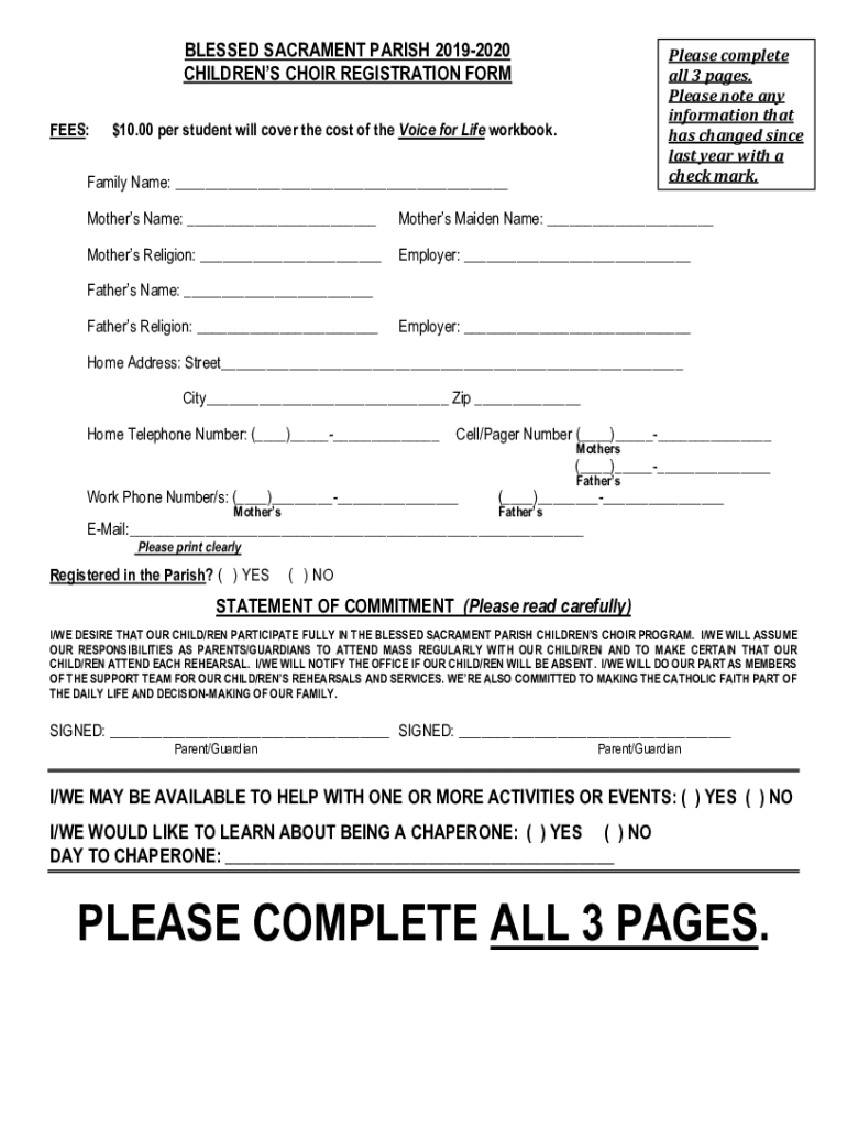 BLESSED SACRAMENT PARISH 20192020 CHILDREN CHOIR REGISTRATION FORM FEES:Please complete all 3 pages. Please note any information that has changed since last year with a check mark.$10.00 per student