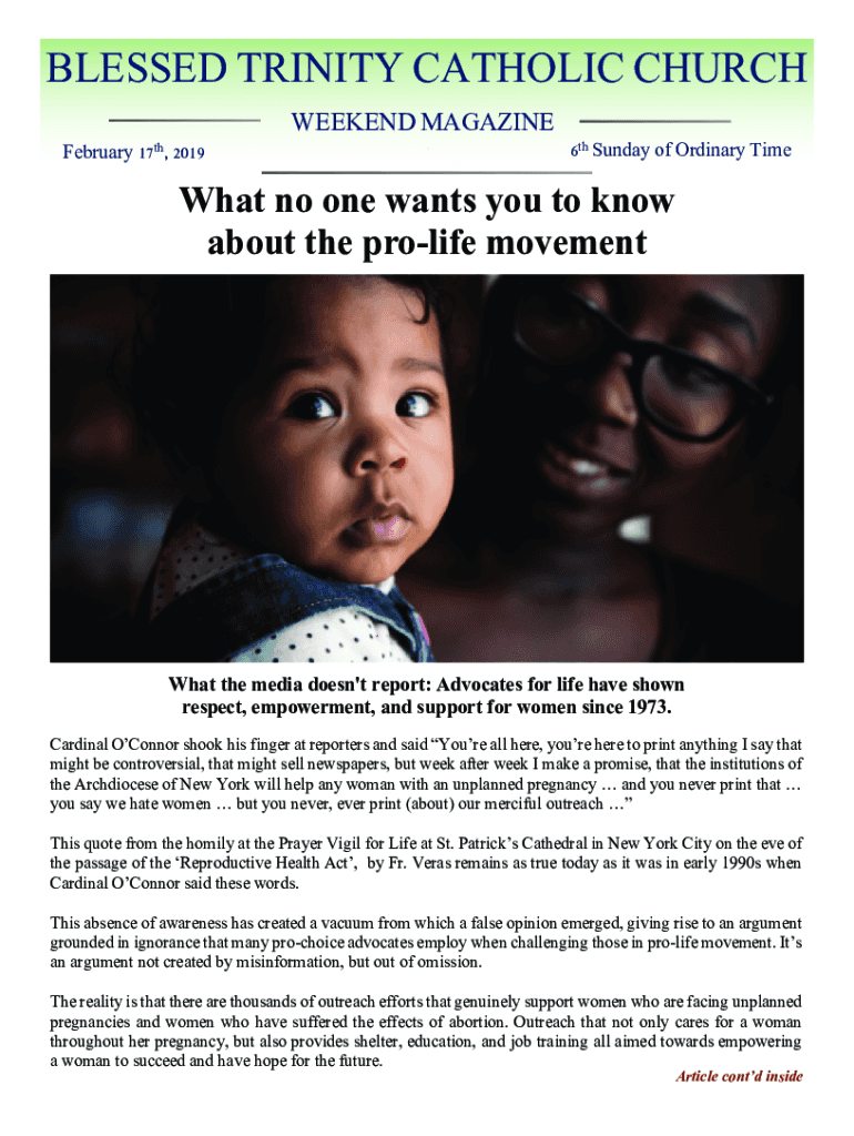 BLESSED TRINITY CATHOLIC CHURCH WEEKEND MAGAZINE February 17th, 20196th Sunday of Ordinary Somewhat no one wants you to know about the pro-life movementWhat the media doesn't\'t report: Advocates