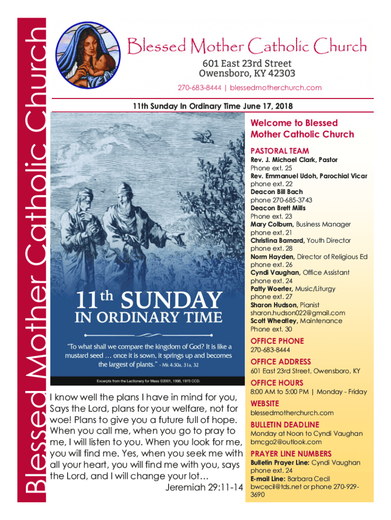 Blessed Mother Catholic Church2706838444 | blessedmotherchurch.com11th Sunday In Ordinary Time June 17, 2018Welcome to Blessed Mother Catholic Church PASTORAL TEAM Rev. J. Michael Clark, Pastor Phone