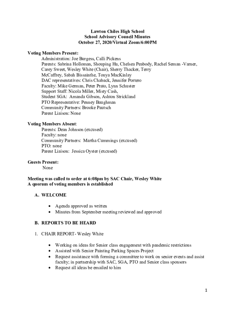 Lawton Chile's High School Advisory Council Minutes October 27, 2020/Virtual Zoom/6:00PM Voting Members Present: Administration: Joe Burgess, Call Pickens Parents: Sabrina Hollman, Shopping HU, Chelsea