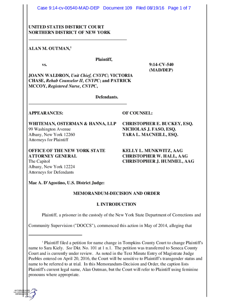 Case 9:14cv00540MADDEP Document 109 Filed 08/19/16-Page 1 of 7UNITED STATES DISTRICT COURT NORTHERN DISTRICT OF NEW YORK ___ ALAN M. OUTRAN,1 Plaintiff, vs.9:14CV540 (MAD/DEP)JOANN WALDRON, Unit Chief,