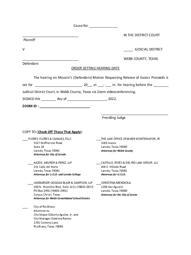 Cause No. ___ ___ Plaintiff IN THE DISTRICT COURT___ JUDICIAL DISTRICT___ Defendant ORDER SETTING HEARING DATELESS COUNTY, Texas hearing on Moments (Defendant) Motion Requesting Release of Excess