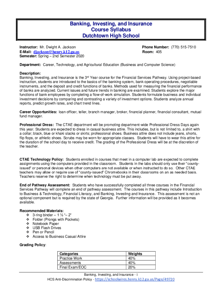 Banking, Investing, and Insurance Course Syllabus Dutch town High School Instructor: Mr. Dwight A. Jackson Email: djackson@henry.k12.ga.us Semester: Spring 2nd Semester 2020Phone Number: (770) 5157510