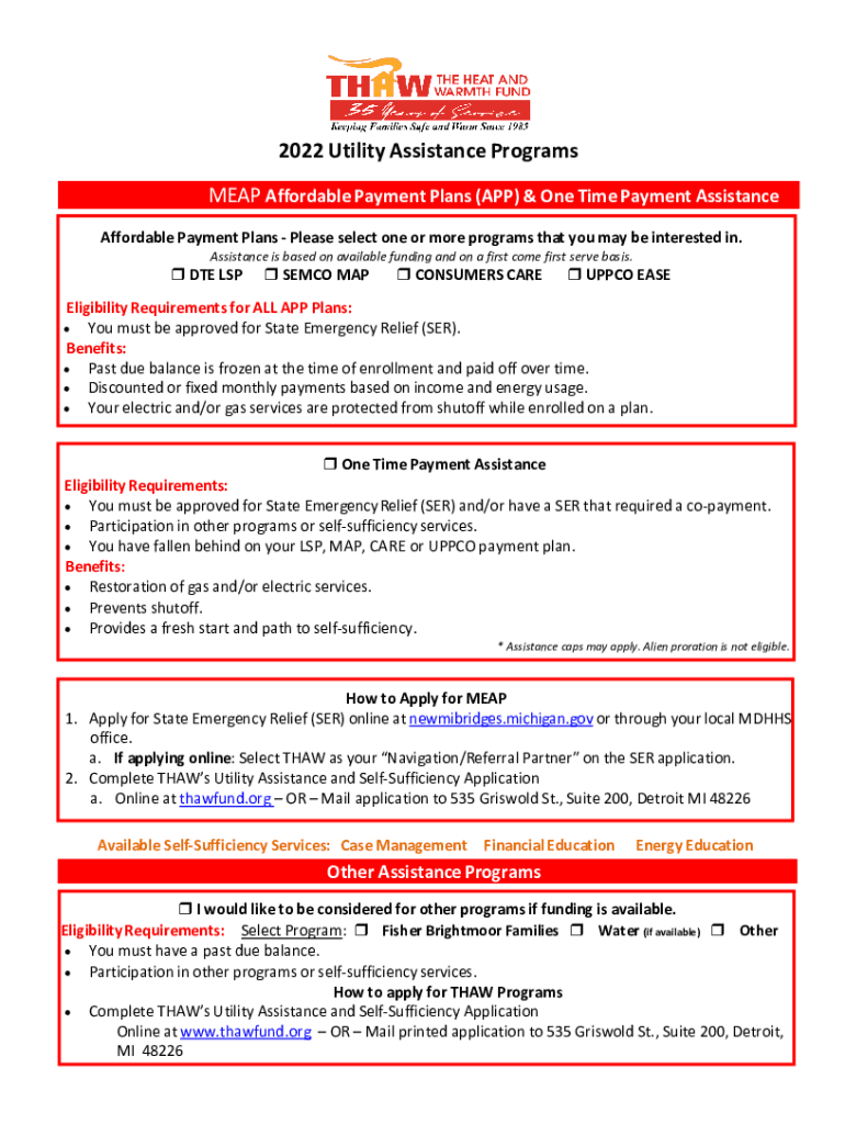 2022 Utility Assistance Programs MEAN Affordable Payment Plans (APP) & One Time Payment Assistance Affordable Payment Plans Please select one or more programs that you may be interested in. Assistance