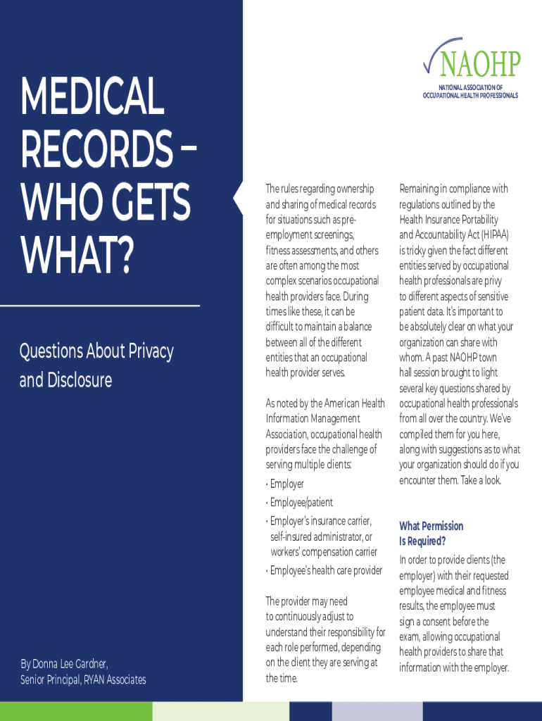 MEDICAL RECORDS WHO Get WHAT? Questions About Privacy and DisclosureNATIONAL ASSOCIATION OF OCCUPATIONAL HEALTH Professionals rules regarding ownership and sharing of medical records for situations