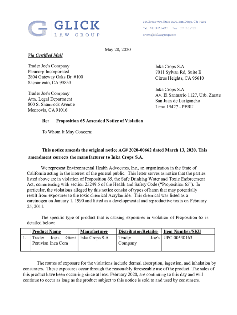 Via Certified Mailman 28, 2020Trader Joe\'s Company