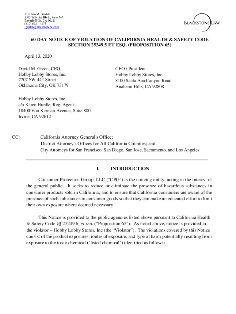 Jonathan M. Jewish 8383 Wilshire Blvd., Suite 745 Beverly Hills, CA 90211 (310) 622 4278 jgenish@blackstonepc.com60 DAY NOTICE OF VIOLATION OF CALIFORNIA HEALTH & SAFETY CODE SECTION 25249.5 ET ESQ.