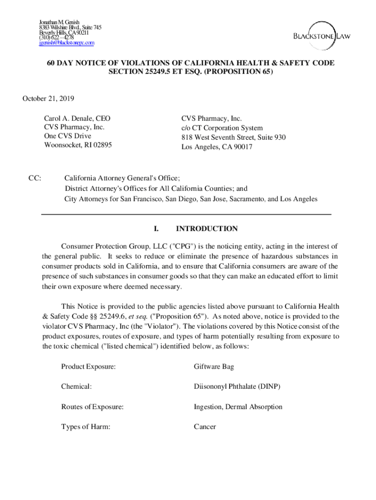 Jonathan M. Jewish 8383 Wilshire Blvd., Suite 745 Beverly Hills, CA 90211 (310) 622 4278 jgenish@blackstonepc.com60 DAY NOTICE OF VIOLATIONS OF CALIFORNIA HEALTH & SAFETY CODE SECTION 25249.5 ET ESQ.