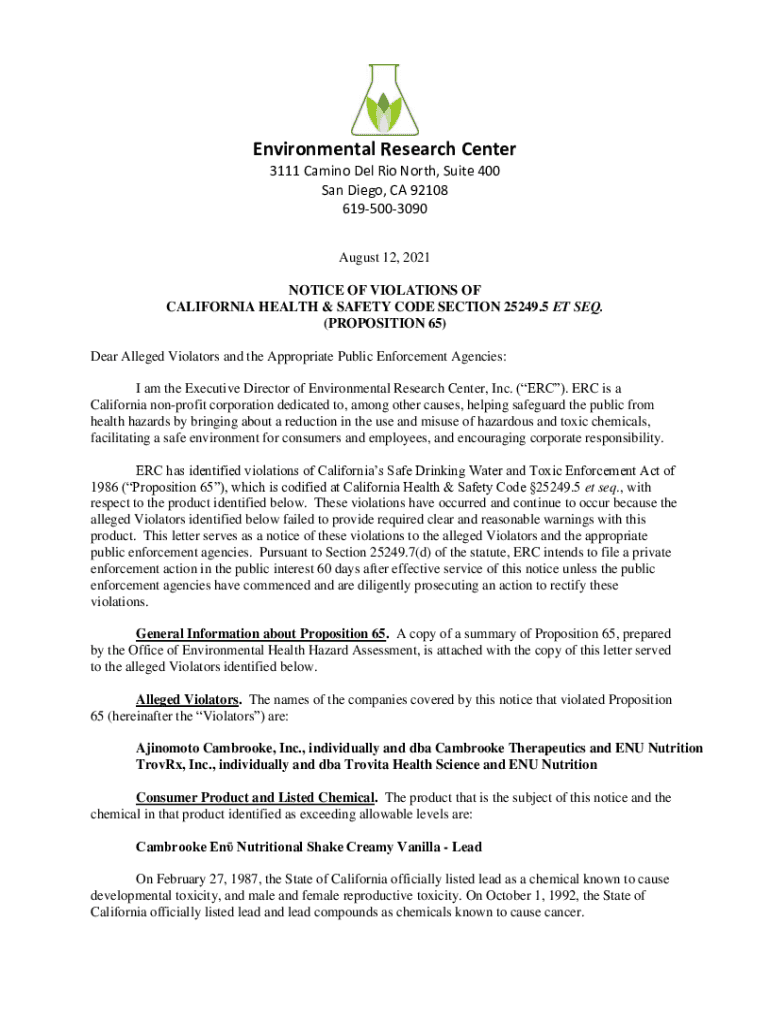 Environmental Research Center 3111 Camino Del Rio North, Suite 400 San Diego, CA 92108 6195003090 August 12, 2021, NOTICE OF VIOLATIONS OF CALIFORNIA HEALTH & SAFETY CODE SECTION 25249.5 ET SEQ. (PROPOSITION