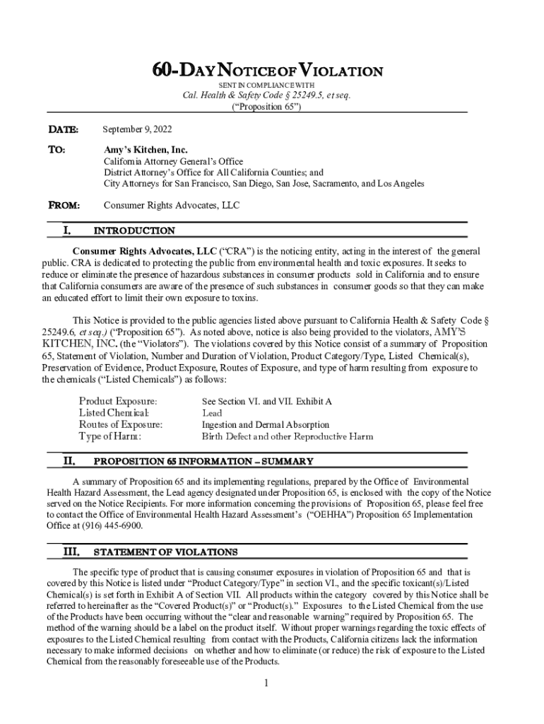 60DAY NOTICE OF VIOLATION SENT IN COMPLIANCE Withal. Health & Safety Code 25249.5, et seq. (Proposition 65)DATE:September 9, 2022TO:Amy's Kitchen, Inc. California Attorney Generals Office District