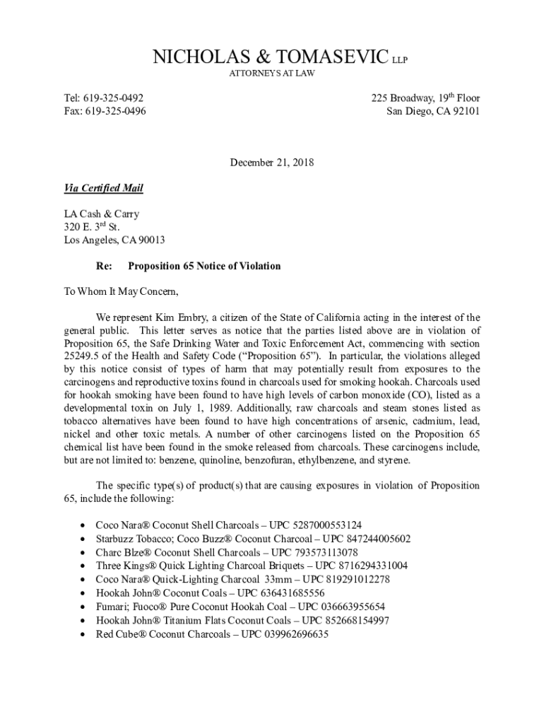 NICHOLAS & TOMASEVIC LLP ATTORNEYS AT LAW225 Broadway, 19th Floor San Diego, CA 92101Tel: 6193250492 Fax: 6193250496December 21, 2018 Via Certified Mail LA Cash & Carry 320 E. 3rd St. Los Angeles,
