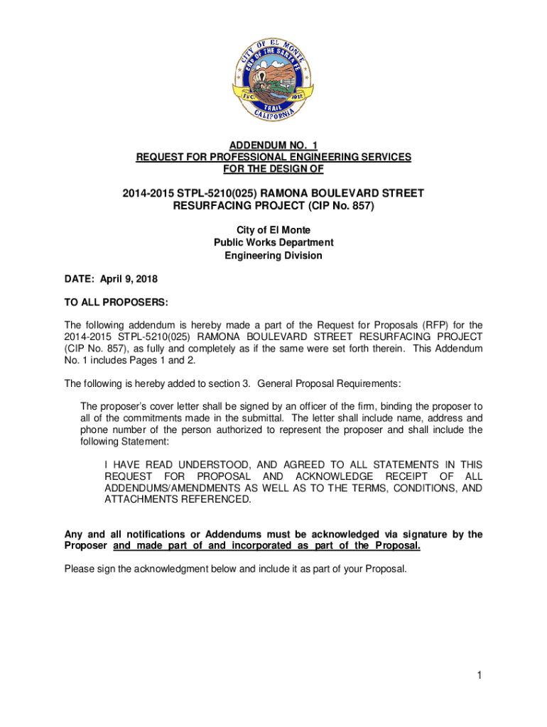 ADDENDUM NO. 1 REQUEST FOR PROFESSIONAL ENGINEERING SERVICES FOR THE DESIGN OF20142015 STPL5210(025) RAMONA BOULEVARD STREET RESURFACING PROJECT (CIP No. 857) City of El Monte Public Works Department