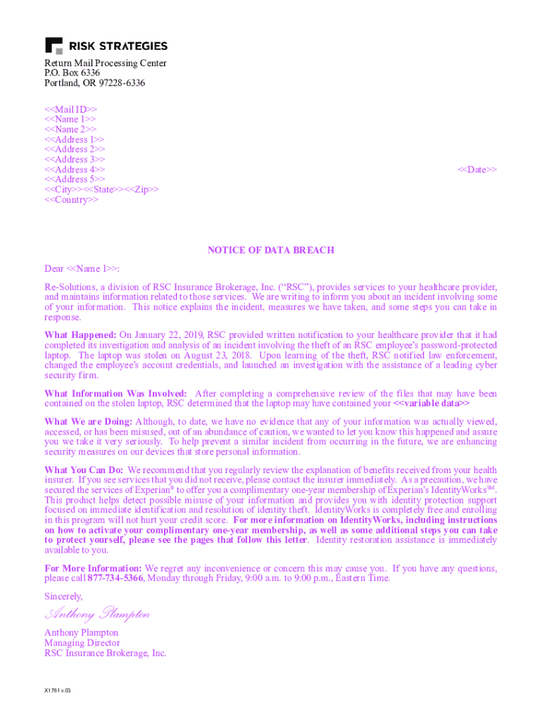 Return Mail Processing Center P.O. Box 6336 Portland, OR 972286336 Mail ID Name 1 Name 2 Address 1 Address 2 Address 3 Address 4Address 5 CityStateZip CountryDateNOTICE OF DATA BREACH Dear Name 1: