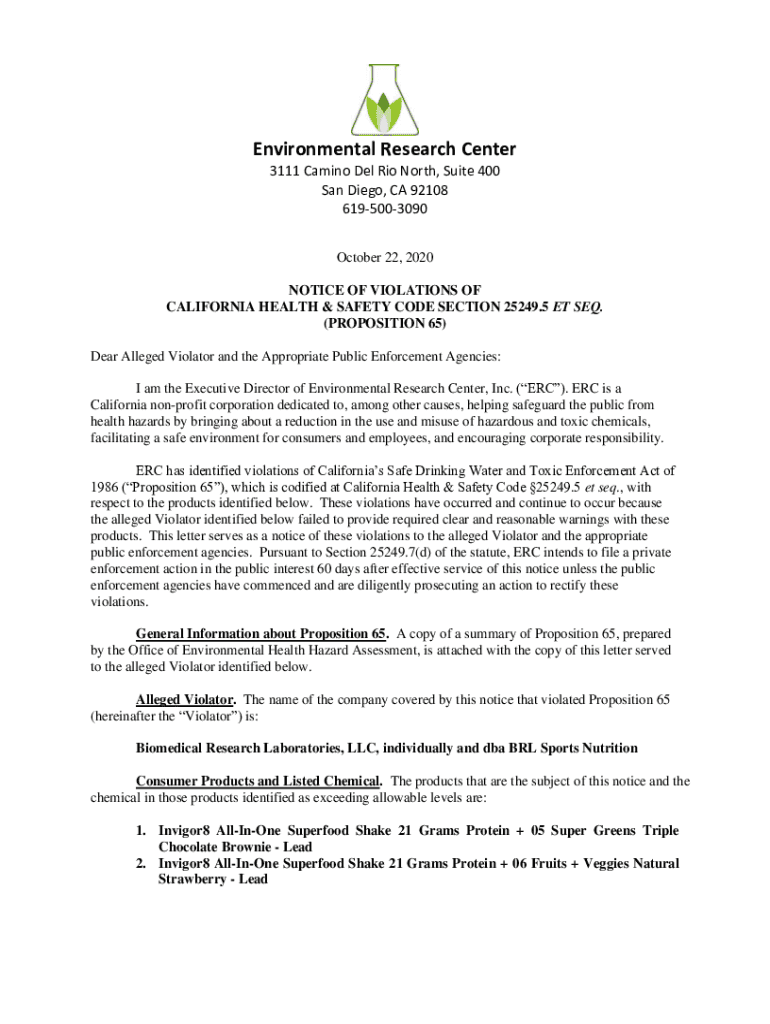Environmental Research Center 3111 Camino Del Rio North, Suite 400 San Diego, CA 92108 6195003090 October 22, 2020, NOTICE OF VIOLATIONS OF CALIFORNIA HEALTH & SAFETY CODE SECTION 25249.5 ET SEQ.