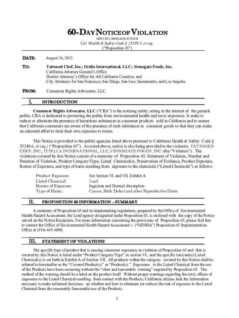 60DAY NOTICE OF VIOLATION SENT IN COMPLIANCE Withal. Health & Safety Code 25249.5, et seq. (Proposition 65)DATE:August 26, 2022TO:Tattooed Chef, Inc.; Stella International, LLC; Stone gate Foods,