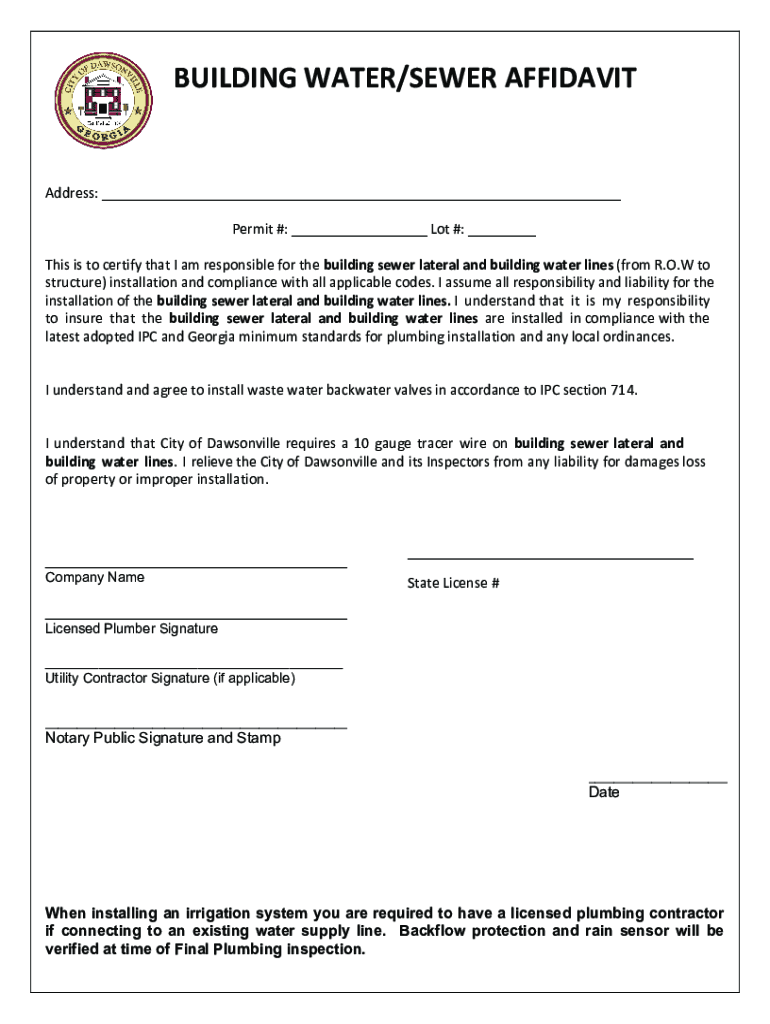 Get the free BUILDING WATER/SEWER AFFIDAVIT - Dawsonville, Georgia