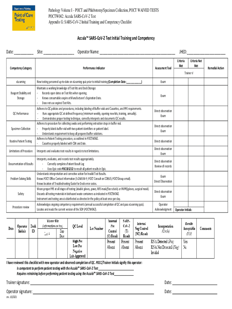 Pathology Volume I POST and Phlebotomy/Specimen Collection, POST WAIVED TESTS POCTW042: Accela SARSCoV2 Test Appendix G: SARSCoV2 Initial Training and Competency ChecklistAccula SARSCoV2 Test Initial