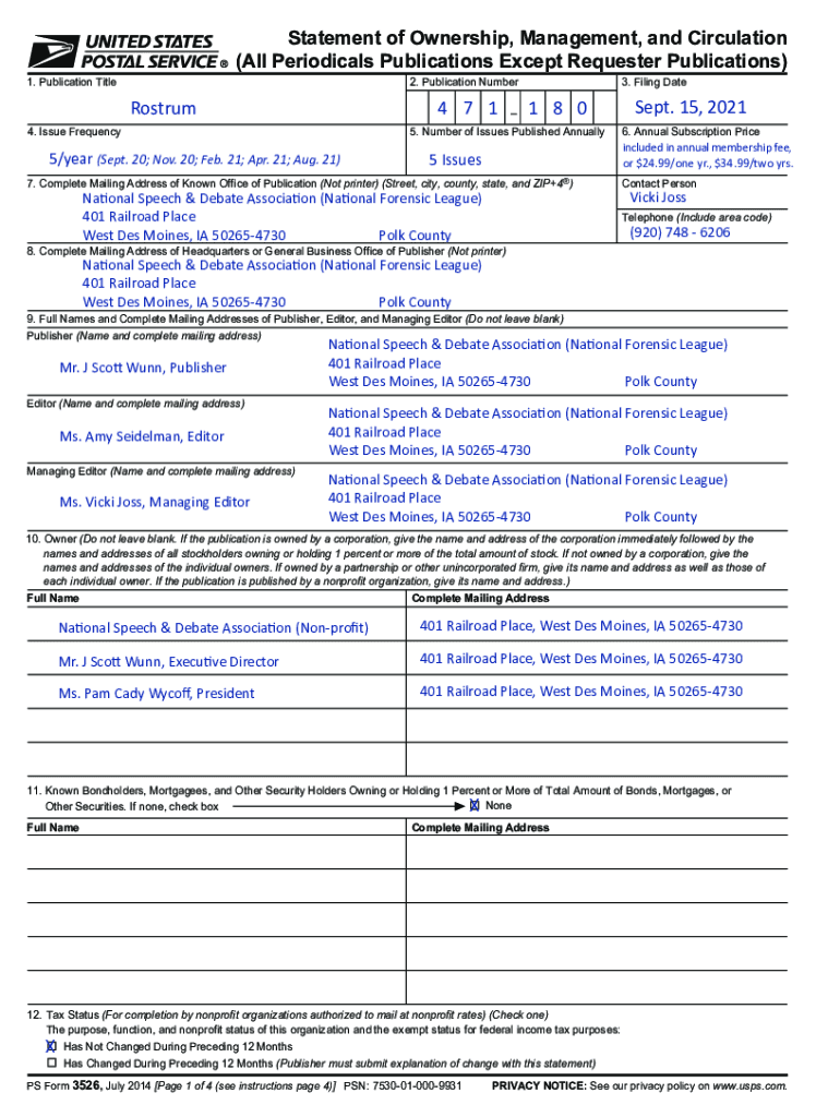 Statement of Ownership, Management, and Circulation (All Periodicals Publications Except Requester Publications)1. Publication Title2. Publication NumberRostrum4 7 14. Issue Frequency_3. Filing Date1