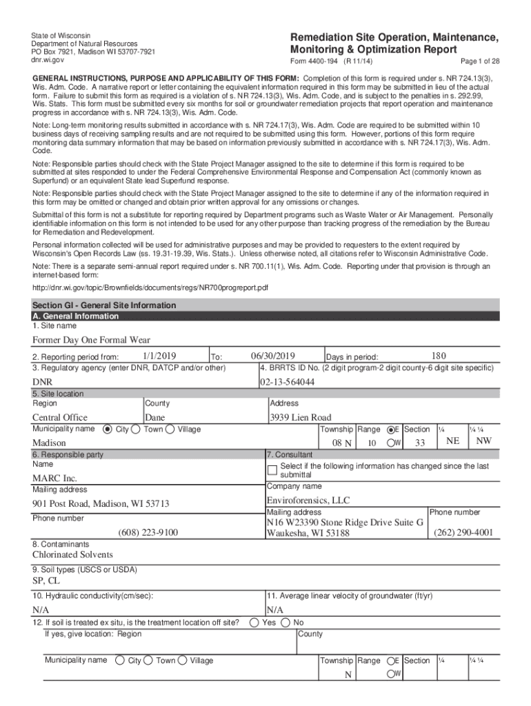 State of Wisconsin Department of Natural Resources PO Box 7921, Madison WI 537077921 DNR.WI.remediation Site Operation, Maintenance, Monitoring & Optimization Report Form 4400194 (R 11/14)Page 1 of