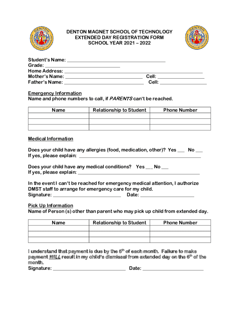 DENTON MAGNET SCHOOL OF TECHNOLOGY EXTENDED DAY REGISTRATION FORM SCHOOL YEAR 2021 2022 Students Name: ___ Grade: ___ Home Address: ___ Mothers Name: ___ Cell: ___ Fathers Name: ___ Cell: ___ Emergency