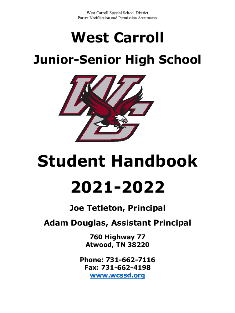 West Carroll Special School District Parent Notification and Permission Assurances West Carroll Junior Senior High SchoolStudent Handbook 20212022 Joe Telethon, Principal Adam Douglas, Assistant Principal
