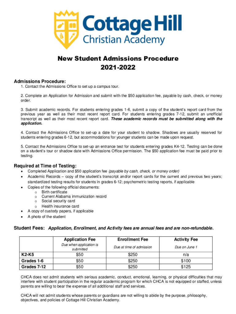 New Student Admissions Procedure 20212022 Admissions Procedure: 1. Contact the Admissions Office to set up a campus tour. 2. Complete an Application for Admission and submit with the $50 application