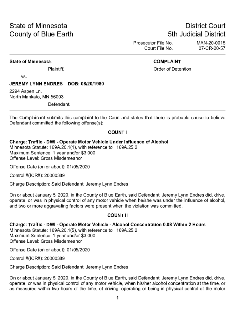 StateofMinnesota CountyofBlueEarthDistrictCourt 5thJudicialDistrict ProsecutorFileNo. CourtFileNo. StateofMinnesota,MAN200015 07CR2057COMPLAINTPlaintiff,OrderofDetentionvs. JEREMYLYNNENDRESDOB:08/20/1980