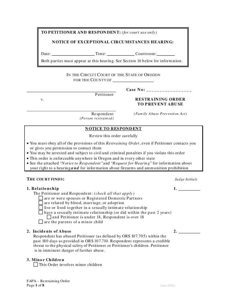TO PETITIONER AND RESPONDENT: (for court use only) NOTICE OF EXCEPTIONAL CIRCUMSTANCES HEARING: Date:Time:Courtroom:Both parties must appear at this hearing. See Section 16 below for information.IN
