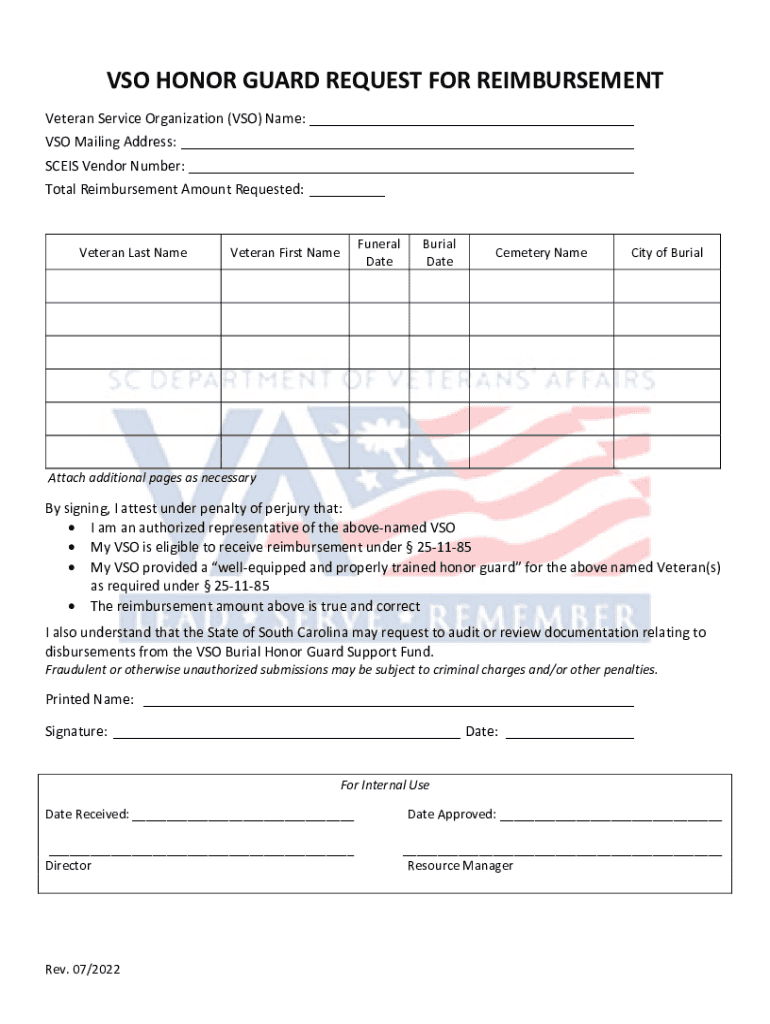 STANDARD OPERATING PROCEDURE Veteran Service Organization (SO) Burial Honor Guard Support Fund PURPOSE Establish policy and procedures for the SO Burial Honor Guard Support Fund created by S.C. Code