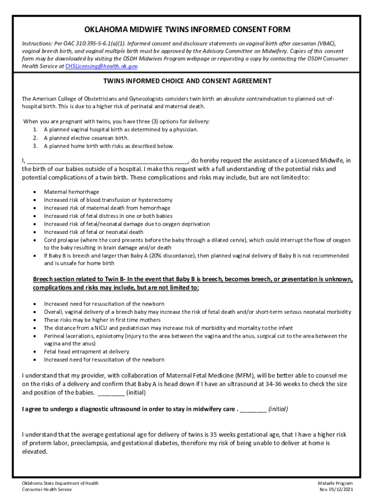 Oklahoma midwife twins informed is a form that must be completed by midwives attending twin births in the state of Oklahoma.