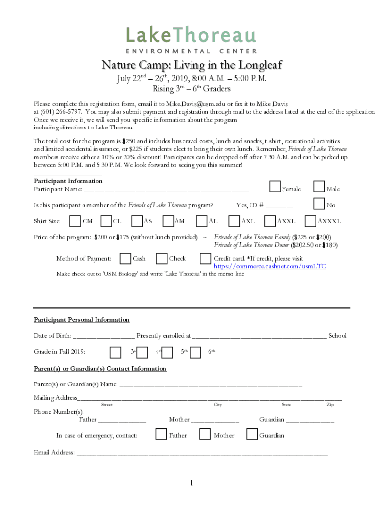 Nature Camp: Living in the Long leaf July 22nd 26th, 2019, 8:00 A.M. 5:00 P.M. Rising 3rd 6th Graders Please complete this registration form, email it to Mike.Davis@usm.edu or fax it to Mike Davis
