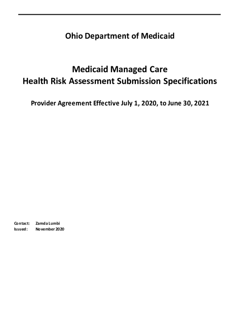Ohio Department of Medicaid Managed Care Health Risk Assessment Submission Specifications Provider Agreement Effective July 1, 2020, to June 30, 2021Contact: Issued:Tampa Alumni November 2020Table