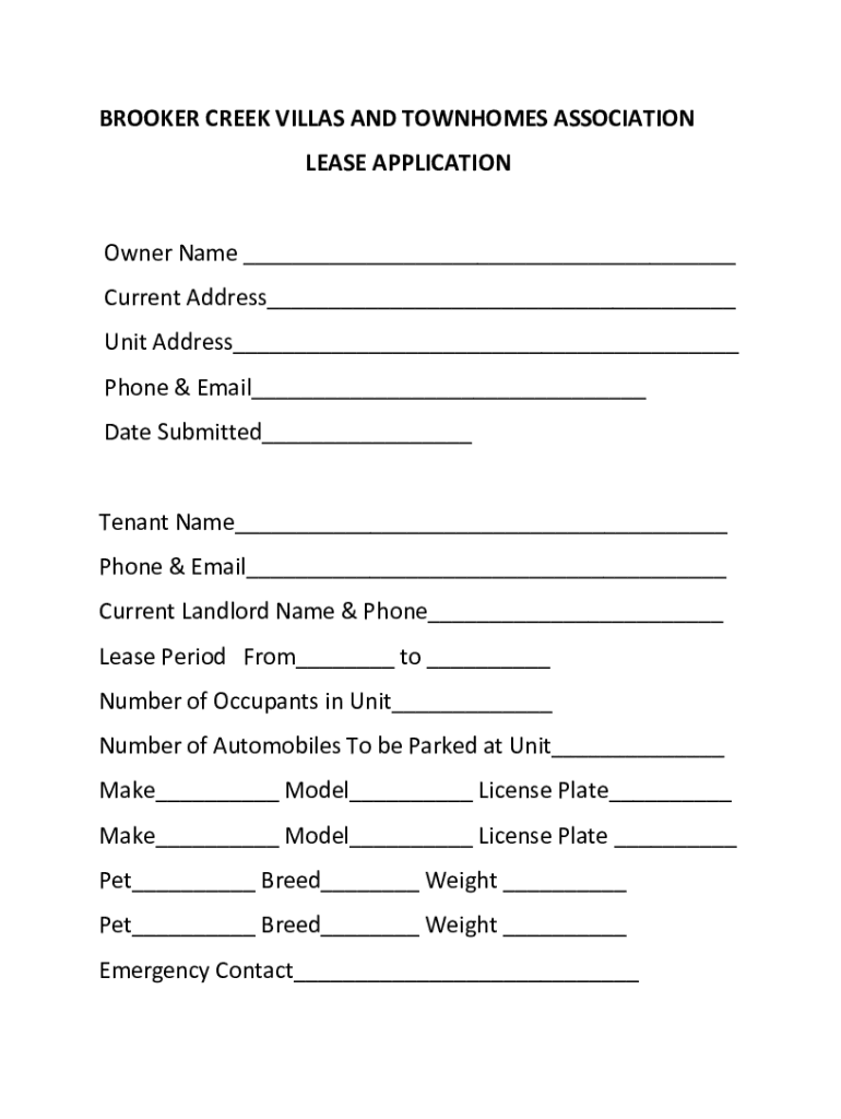 Get the free BROOKER CREEK VILLAS AND TOWNHOMES ASSOCIATION LEASE APPLICATION - Webflow