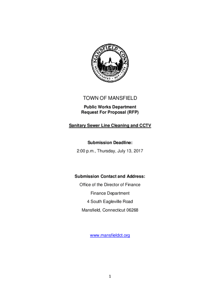 TOWN OF MANSFIELD Public Works Department Request For Proposal (RFP) Sanitary Sewer Line Cleaning and CCTVSubmission Deadline: 2:00 p.m., Thursday, July 13, 2017Submission Contact and Address: Office
