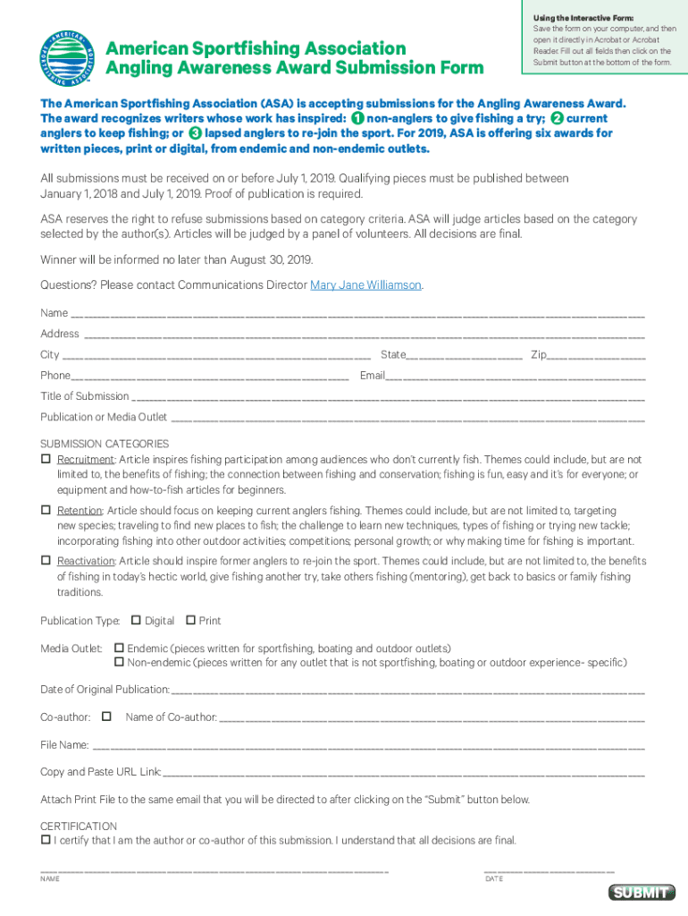 American Sport fishing Association Angling Awareness Award Submission Forming the Interactive Form: Save the form on your computer, and then open it directly in Acrobat or Acrobat Reader. Fill out