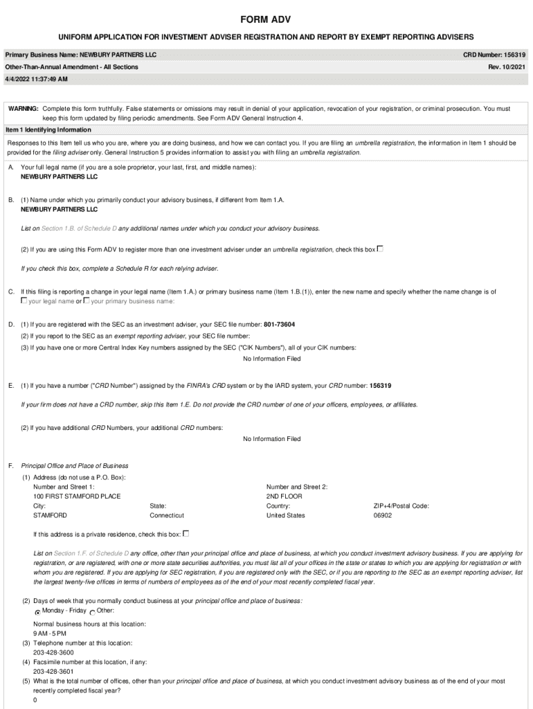 FORM ADV UNIFORM APPLICATION FOR INVESTMENT ADVISER REGISTRATION AND REPORT BY EXEMPT REPORTING ADVISERS Primary Business Name: NEWBURY PARTNERS LLC CRD Number: 156319OtherThanAnnual Amendment All