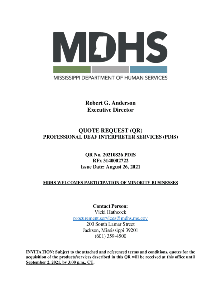Robert G. Anderson Executive Directorate REQUEST (QR) PROFESSIONAL DEAF INTERPRETER SERVICES (PDS)QR No. 20210826 PDS Rex 3140002722 Issue Date: August 26, 2021, MDS WELCOMES PARTICIPATION OF MINORITY