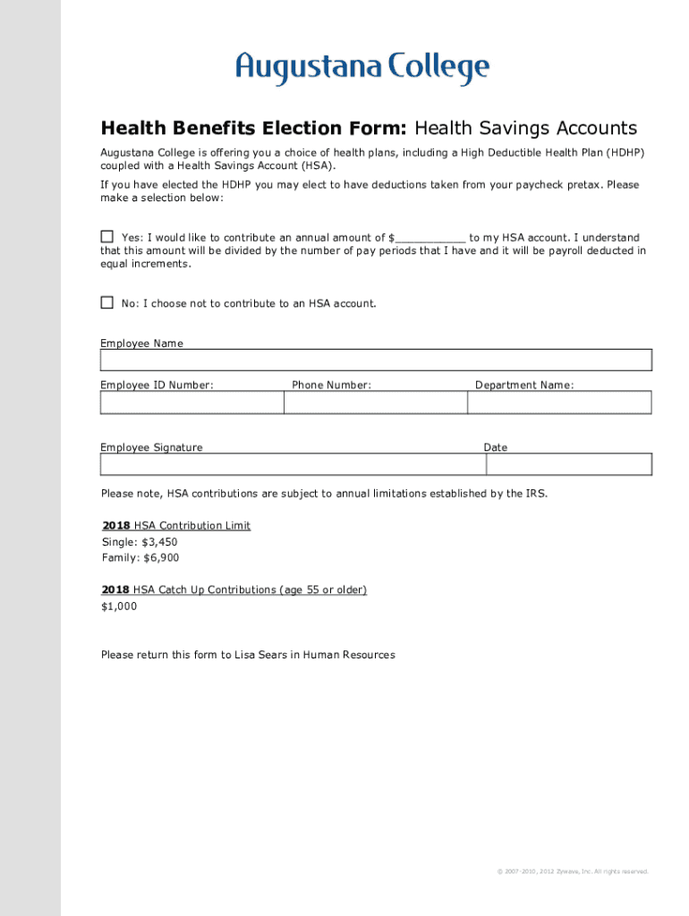Health Benefits Election Form: Health Savings Accounts Augustan College is offering you a choice of health plans, including a High Deductible Health Plan (DHP) coupled with a Health Savings Account