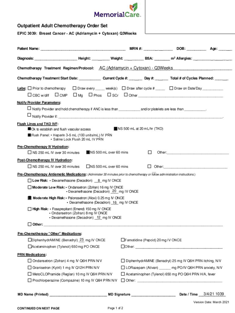 Outpatient Adult Chemotherapy Order Set EPIC 3039: Breast Cancer AC (+ Ottoman) Q3WeeksPatient Name: ___MAN #: ___DOB: ___Age: ___Diagnosis: ___ Height: ___ Weight: ___ BSA: ___ m2 Allergies: ___