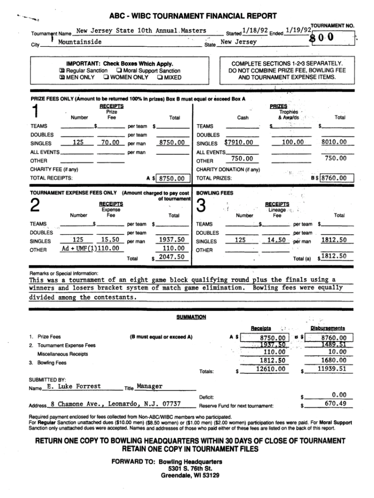 ABC WISC TOURNAMENT FINANCIAL REPORT Tournament Name New Jersey State 10th Annual. Masters city\' Mountainside___.___ _started_1/18/92Ended1/19/92 Otto New JerseyIMPORTANT: Check Boxes Which Apply.