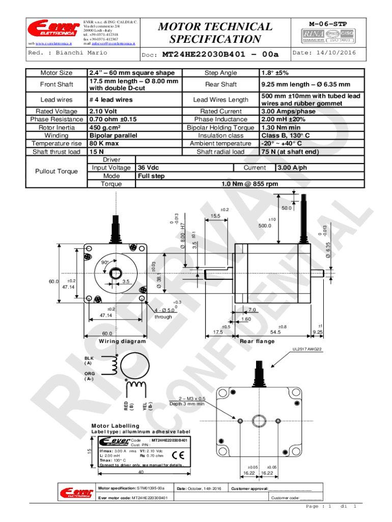Red. Bianchi Mario Motor Size Front Shaft Lead wires Rated Voltage Phase Resistance Rotor Inertia Winding Temperature rise Shaft thrust load Pullout TorqueM06STPMOTOR TECHNICAL SPECIFICATION2.4 60