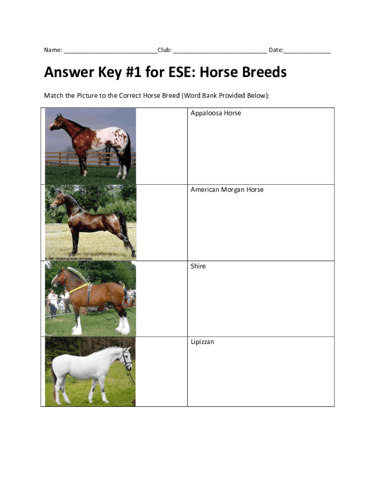 Name: ___Club: ___ Date:___Answer Key #1 for ESE: Horse Breeds Match the Picture to the Correct Horse Breed (Word Bank Provided Below): Appaloosa Horse American Morgan HorseShireLipizzanAmerican Shetland