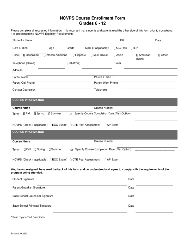 NC VPS Course Enrollment Form Grades 6 12 Please complete all requested information. It is important that students and parents read the other side of this form prior to completing it to understand