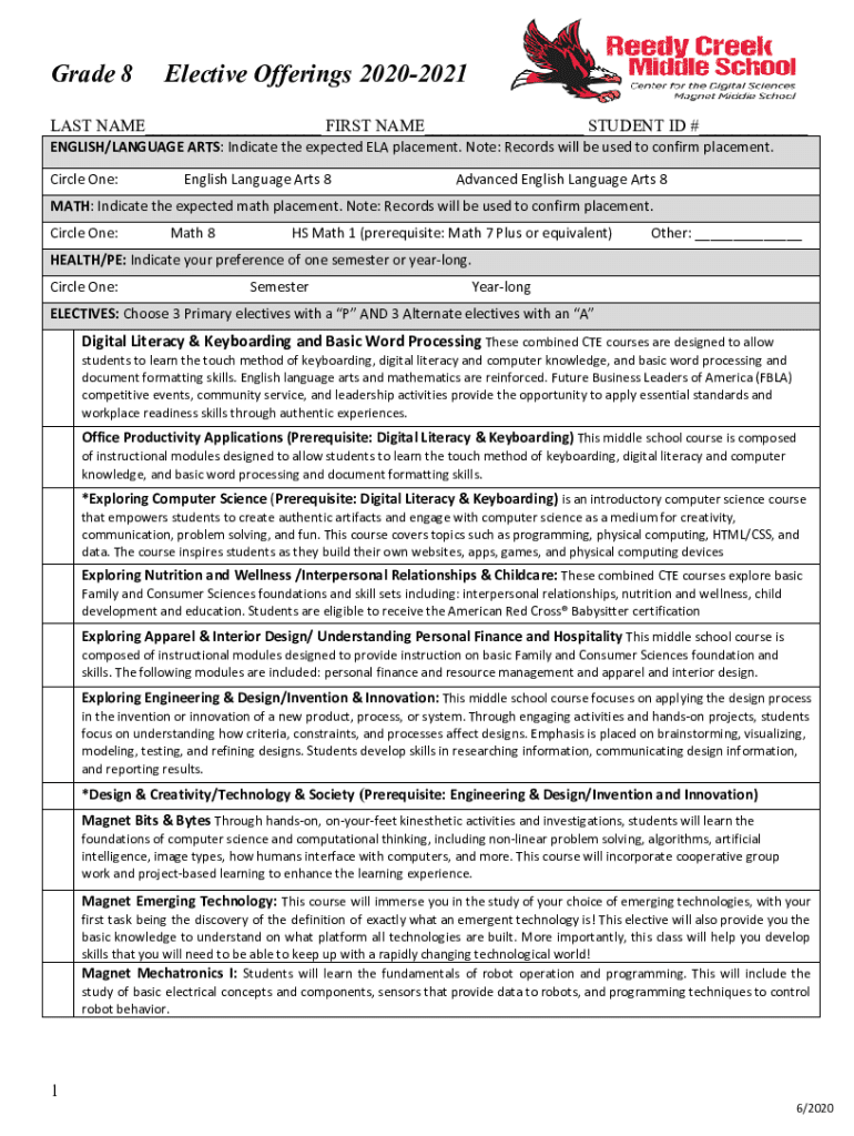 Grade 8Elective Offerings 20202021LAST NAME___ FIRST NAME___ STUDENT ID #___ ENGLISH/LANGUAGE ARTS: Indicate the expected ELA placement. Note: Records will be used to confirm placement. Circle One:English