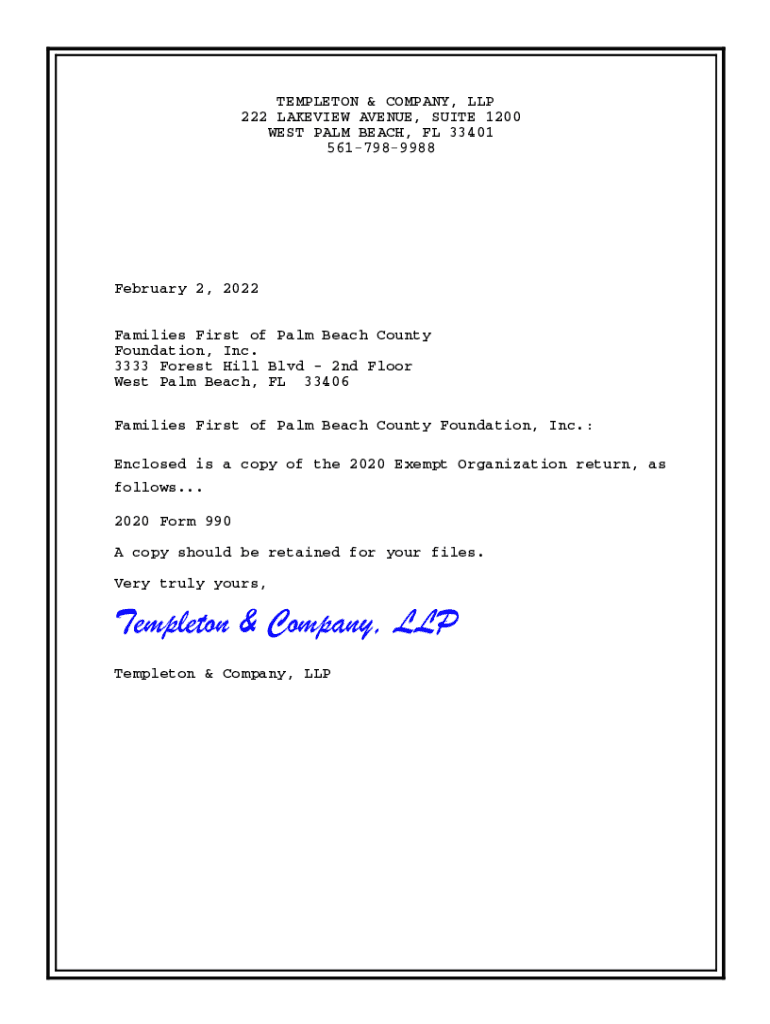 TEMPLETON & COMPANY, LLP 222 REVIEW AVENUE, SUITE 1200 WEST PALM Beaches, FL 33401 5617989988February 2, 2022 Families First of Palm Beach County Foundation, Inc. 3333 Forest Hill Blvd 2nd Floor West