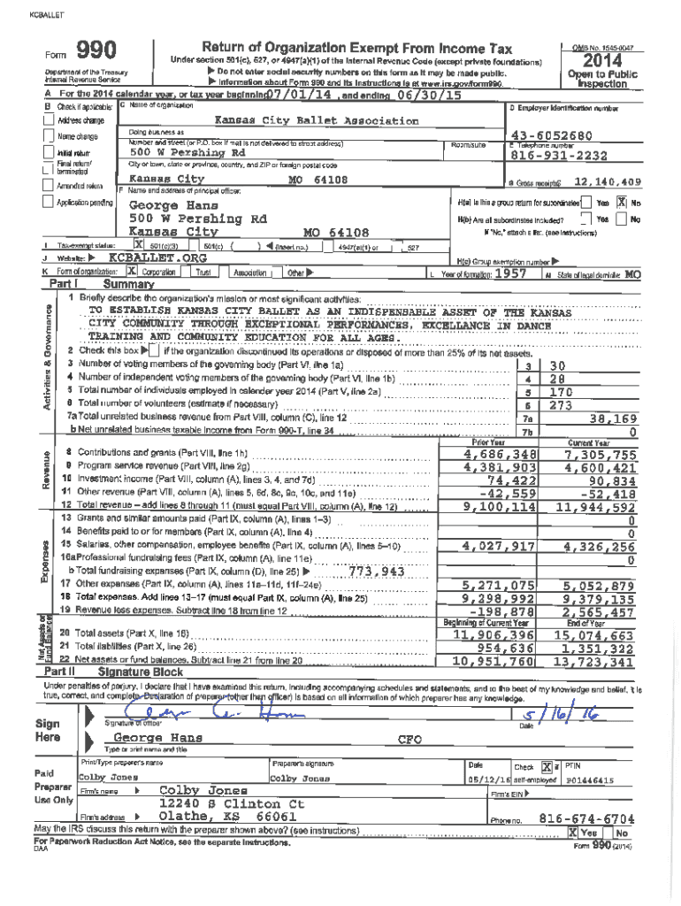 KCBALLETForm 990 (2014)Part III 1Kansas City Ballet Association436052680Statement of Program Service Accomplishments Check if Schedule O contains a response or note to any line in this Part III Page.......................................2XBriefly